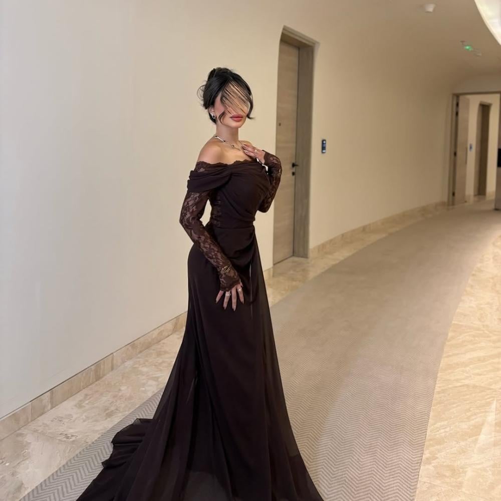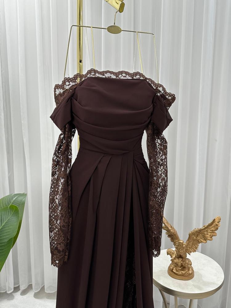 ارتقي بإطلالتك في المناسبات الراقية مع هذا الفستان البني الأنيق أوف شولدر، المصمم ليمزج بين الأنوثة والرقي بكل تفاصيله. يتميز بقصة ناعمة تنسدل بانسيابية، مع أكمام من الدانتيل الشفاف تضيف لمسة ساحرة.